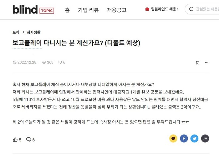 | ▲ 지난 연말 올라온 보고플레이 경영난 우려 게시글 [인터넷 커뮤니티 '블라인드' 게시물 캡처] |