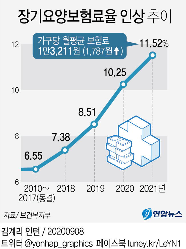보험료율은 2010년부터 2017년까지 6.55%로 동결되다가 2018년 7.38%, 2019년 8.51%, 2020년 10.25%로 올랐는데 내년까지 더하면 4년 연속 인상되는 셈이다.