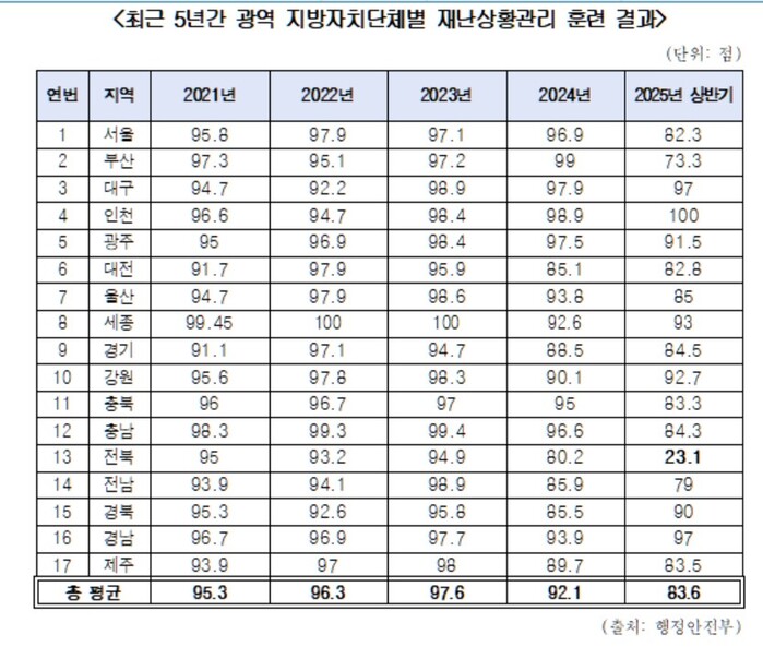 28일 더불어민주당 한병도 의원(전북 익산을)이 행정안전부로부터 제출받은 자료에 따르면, 지난 5년간 광역별 재난상황관리 훈련 점수 평균은 2021년 95.3점, 2022년 96.3점, 2023년 97.6점으로 소폭 상승 추세를 보이다 2024년 92.1점, 2025년 상반기 83.6점으로 하락세로 돌아선 것으로 확인됐다.