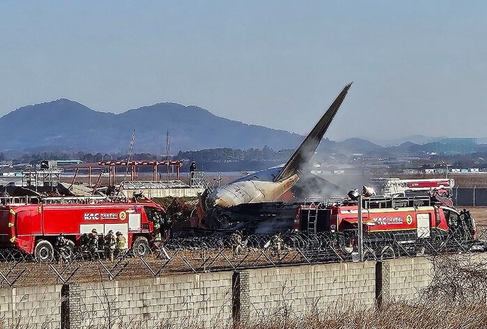 | ▲29일 전남 무안국제공항에서 발생한 여객기 추락 사고현장에서 소방대원들이 화재진압과 인명 구조를 하고 있다. [사진=연합뉴스] |