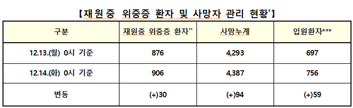 중앙방역대책본부(방대본)은 14일 0시 기준으로 코로나19로 인한 하루 사망자가 94명이며 위중증 환자는 906명으로 집계됐다고 밝혔다. 하루 사망자 수와 위증증 환자 수 모두 역대 최다치다.