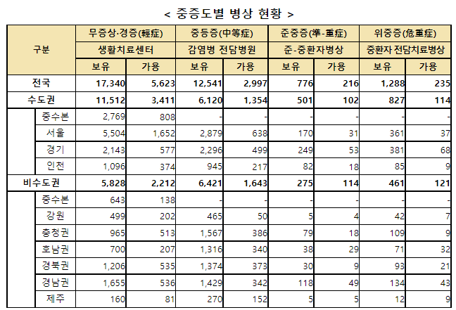 ▲ 14일 기준 중증도별 병상 현황. [중앙재난안전대책본부 제공] |