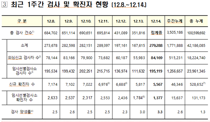 ▲ 14일 0시 기준 최근 1주간 코로나19 검사 및 확진자 현황. [중앙방역대책본부 제공] |
