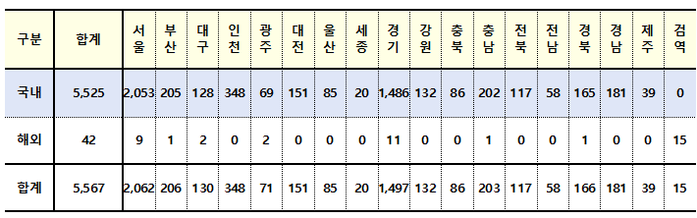 신규 확진자 중 국내감염은 5525명, 해외유입은 42명이다.