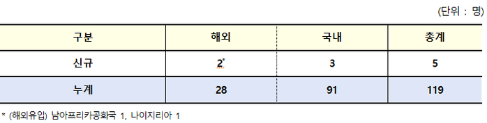 새 코로나19 변이 바이러스인 오이크론 변이 감염자는 이날 0시 기준으로 5명(해외유입 2명, 국내감염 3명)이 추가 확진돼 국내에서 최초 환자가 나온지 13일만에 누적 119명으로 늘었다. 의심사례도 25명이 추가돼 역학적 관련 사례는 총 139명으로 증가했다.