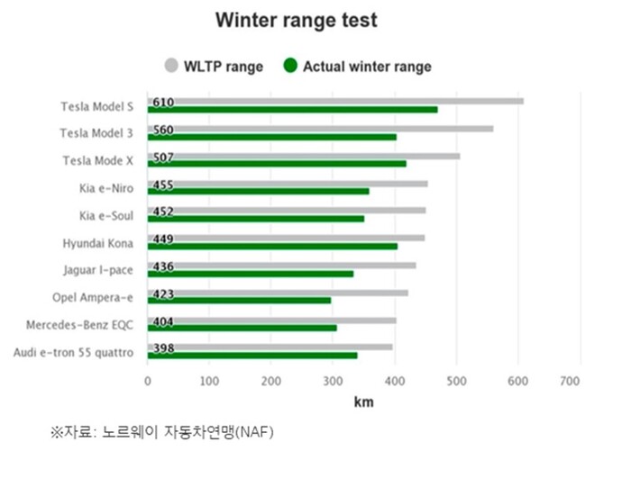 전세계에서 전기차 보급률이 가장 빠른 나라 중 하나인 노르웨이에서 총 20대의 전기차 테스트를 통해 겨울철(영하 2도) 배터리 성능 저하가 주행거리에 얼만큼 영향을 미치는지를 실험한 결과 WLTP 기준 대비 평균 18.5% 주행거리가 감소한 것으로 나타났다.