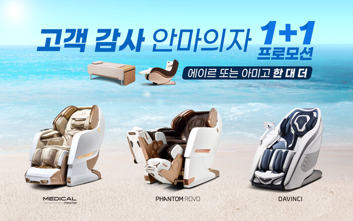 헬스케어 안마의자 ‘팬텀 로보’와 ‘다빈치’를 렌탈 또는 구매하는 고객에게는 컴팩트한 사이즈와 세련된 디자인이 돋보이는 소형 안마의자 ‘아미고’ 또는 편안하게 누워서 마사지 받을 수 있는 침상형 마사지 베드 ‘에이르’를 특별 사은품으로 받아 볼 수 있는 제품 바우처가 주어진다.