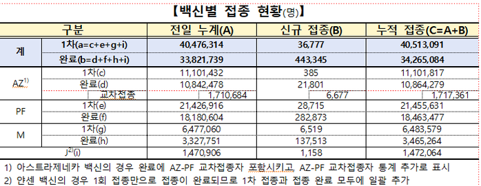 이로써 백신별 누적 1차 접종자는 화이자 2145만5631명, 아스트라제네카 1110만1817명, 모더나 648만3579명이고, 누적 접종 완료자는 화이자 1846만3477명, 아스트라제네카 1086만4279명(교차접종 171만7361명 포함), 모더나 346만5264명이다.