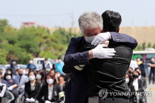 ▲ 고(故) 이선호 씨의 아버지 이재훈 씨가 19일 이씨의 시민장(葬)에서 추모사를 마친 이씨의 친구를 안아주고 있다. 이날 한 친구는 추모사를 통해 "추운 것 정말 싫어하던 선호가 이승을 떠나지 못하고 차가운 안치실에서 오래 머물게 해 정말 미안하다"며 "선호가 행복하고 좋은 꿈만 안고 기다리고 있었으면 좋겠고 이 땅에 더는 이런 비극이 없었으면 한다"고 울먹이며 말했다.[평택=연합뉴스] |