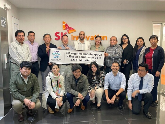 | ▲SK이노베이션 페루 리마 지사 구성원들이 2030 부산엑스포 유치를 응원하고 있다. [사진=SK이노베이션] |