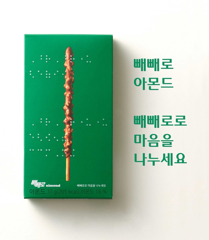 이번 롯데웰푸드가 후원한 제품은 전면 상단에 '빼빼로 아몬드'가, 하단에는 '빼빼로로 마음을 나누세요'가 각각 점자로 적혀있다. 측면에도 '빼빼로 아몬드'가 점자로 새겨졌다.