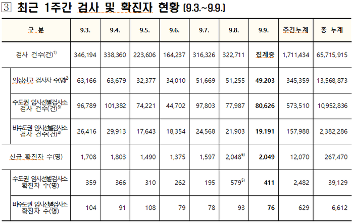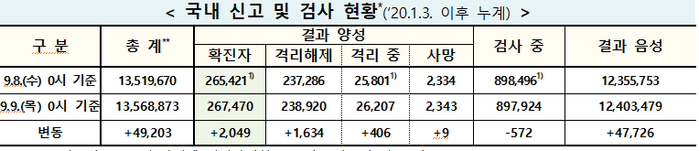 중앙방역대책본부는 9일 0시 기준으로 신규 확진자가 2049명 발생해 누적 26만7470명(해외유입 누적은 1만3831명)으로 집계됐다고 밝혔다.