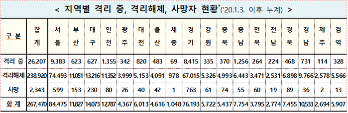 ▲ 9일 0시 기준 코로나19 지역별 격리 및 사망자 현황. [출처=질병관리청] |