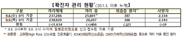 ▲ 9일 0시 기준 코로나19 확진자 관리 현황. [출처=질병관리청] |