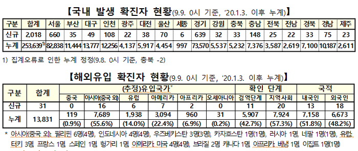 신규 확진자 중 전국 곳곳에서 나온 국내발생(이하 지역발생)은 2018명이고 해외유입은 31명이다. 전날보다 지역발생은 6명 많으나 해외유입은 5명이 적다. 이날도 전국 17개 광역지자체 시도에서 모두 지역발생 확진자가 나왔다.