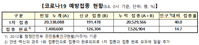 이로써 2020년 12월 행정안전부 주민등록인구현황(거주자) 기준 인구 대비 1차 접종률은 40.0%에 도달했고, 접종 완료율은 14.7%를 기록했다.