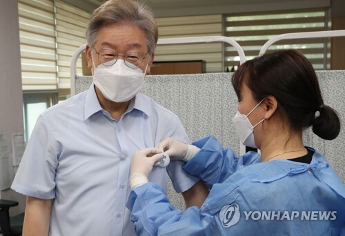 ▲ 이재명 경기도지사가 6일 오전 경기 수원시 팔달구보건소에서 아스트라제네카 백신 2차 접종을 마친 뒤 접종 확인 배지를 받고 있다. [사진=연합뉴스] |