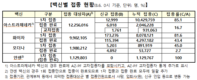 6일 0시 기준 백신별 1차 접종자 현황을 보면, 아스트라제네카 백신이 누적 1042만9759명(신규 1만2999명)으로 전체의 50.8%에 달했고, 이어 화이자 백신이 807만8121명(신규 17만3276명)으로 39.3%, 얀센 백신이 112만9767명(신규 없음)으로 5.5%, 모더나 백신이 89만1919명(신규 5203명)으로 4.3%를 각각 차지했다.