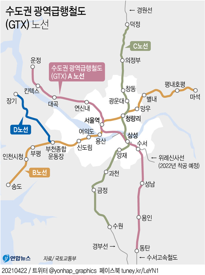 | ▲ 정부가 수도권 서부권역의 급증하는 교통 수요를 해결하기 김포와 부천을 잇는 광역급행철도(GTX)-D 노선을 구축한다. 국토교통부는 22일 발표한 제4차 국가철도망 구축계획안(2016∼2025년)에 서부권 GTX 신설사업을 포함했다. [서울=연합뉴스] |