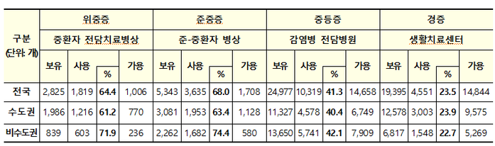 ▲ 23일 0시 기준 코로나19 치료 병상 현황. [중앙방역대책본부 제공] |
