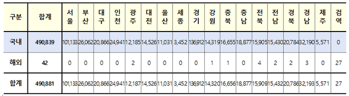 신규 확진자를 감염경로별로 보면 국내 지역발생이 49만839명이고 해외유입이 42명이다.