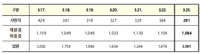 박향 총괄반장은 “위중증환자의 증가는 확진자 증가 폭에 비해서 둔화되고 있다”면서도 “정점 이후에 또 당분간 증가할 것으로 예상되기 때문에 3월 말이나 4월 초에는 대략 2천명 내외까지도 발생한다고 가정하고 의료체계도 여기에 대응해 준비하고 있다”고 말했다.