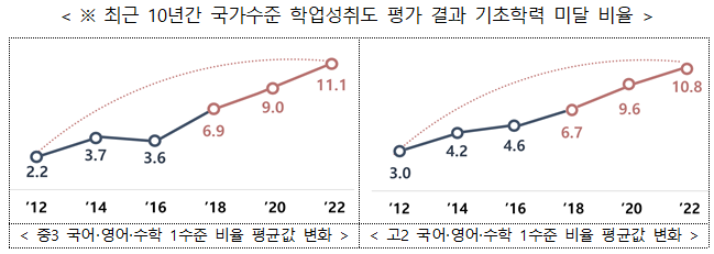 | ▲ 최근 10년간 국가수준 학업성취도 평가 결과 기초학력 미달 비율. [교육부 제공] |