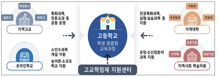 또 학생이 지역‧학교 여건에 관계없이 다양한 과목을 이수할 수 있도록 온라인학교과 공동교육과정을 확대하고, 시도 고교학점제 지원센터 설치를 통한 단위학교 상시 지원 체제를 구축하며 지역 대학 및 기관과의 연계‧협력도 강화한다.