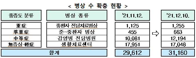 정부가 코로나19 3차 예방접종(부스터샷) 간격을 18세 이상 전체를 대상으로 3개월로 단축하고, 코로나19 전담치료병상 확보를 위한 행정명령을 추가 발동해 약 2천개를 추가 확보한다.