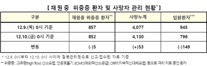 ▲ 10일 0시 기준 재원중 위중증환자 및 사망자 관리 현황. [중앙방역대책본부 제공] |