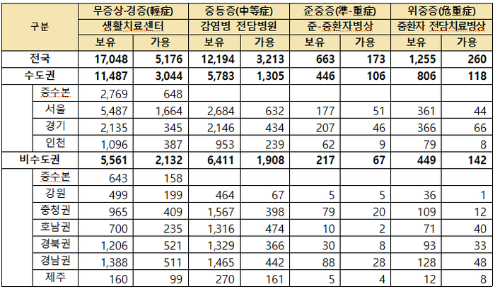 ▲ 중증도별 병상 현황. [중앙재난안전대책본부 제공] |
