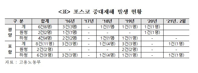 이수진 더불어민주당 의원이 고용노동부로부터 받은 자료에 따르면, 포스코에서는 지난 2016년부터 현재까지 중대재해로 17명의 노동자가 사망했는데 이 가운데 13명이 하청노동자로 조사됐다.