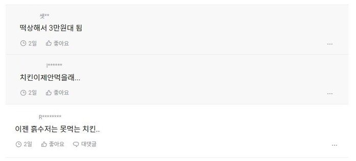 이 중 한 게시글에는 “3만 원대 됐다”, “치킨 이제 안 먹는다”, “이젠 흙수저는 못 먹는 치킨” 등의 댓글이 잇따랐다.