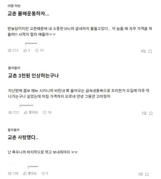 | ▲ 교촌의 가격 인상 발표 이후 온라인 커뮤니티에 올라온 게시물들 [온라인 커뮤니티 캡처] |