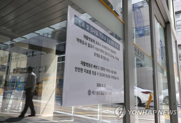 ▲ 신종 코로나바이러스 감염증(코로나19) 확진자가 다수 발생한 서울 서대문구 신촌 세브란스병원 재활병원 입구에 확진자 발생으로 인한 진료 및 검사 중단 안내문이 부착돼 있다.[서울= 연합뉴스] |