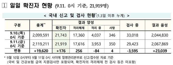 중앙방역대책본부(방대본)는 11일 0시 기준 전날 대비, 코로나19 신규 확진자가 176명 추가 발생했다고 밝혔다. 이로써 지금까지 누적 확진자 수는 총 2만1919명을 기록했다.