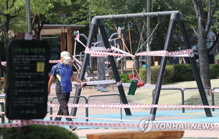 ▲ 수도권 사회적 거리 두기 2.5단계 조치가 연장된 가운데 지난 9일 서울 강동구의 한 공원 놀이터가 임시폐쇄돼 그네가 출입통제 띠로 묶여 있다. [사진= 연합뉴스] |