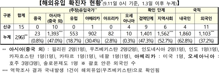 이날 해외유입 확진자는 15명으로, 이 가운데 9명은 공항이나 항만 입국 검역 과정에서 확인됐다. 나머지 6명은 지역 거주지나 임시생활시설에서 자가격리하던 중 확진됐다.