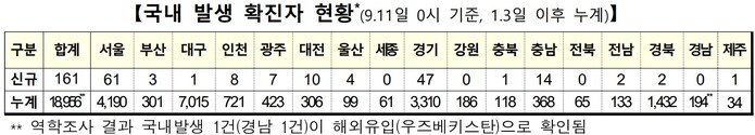 국내발생 161명을 지역별로 보면, 서울 61명, 경기 47명, 인천 8명 등 수도권에서만 116명이 발생했다. 수도권에서 신규 확진자는 전날 98명으로 100명 아래로 떨어졌지만, 이날 18명이 늘어 다시 세 자릿수가 됐다.