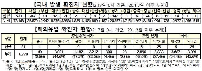 ▲ 17일 0시 기준 전날 대비 코로나19 국내발생 및 해외유입 확진자 현황. [출처= 중앙방역대책본부] |