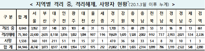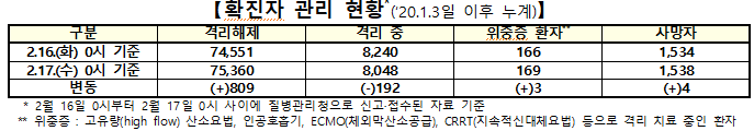 ▲ 17일 0시 기준 전날 대비 코로나19 지역별 격리 및 사망자 현황. [출처= 중앙방역대책본부] |