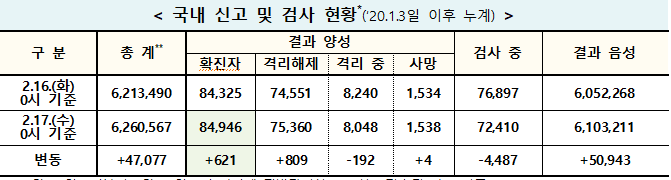 ▲ 17일 0시 기준 전날 대비 코로나19 국내 신고 및 검사 현황. [출처= 중앙방역대책본부] |