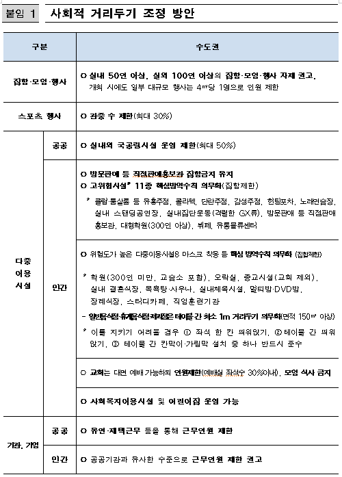 우선 그간 금지됐던 실내 50인, 실외 100인 이상의 집합‧모임‧행사는 개최 자제권고로 변경하고, 프프야구와 프로축구 등 스포츠 행사에 수용인원의 30%까지 관중 입장을 허용하는 등 핵심 방역수칙이 완화된다.