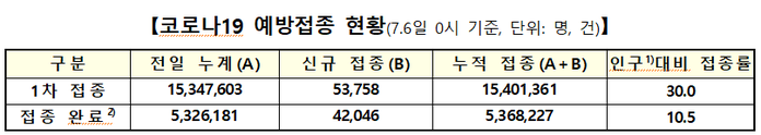 이로써 코로나19 백신 누적 1차 접종자는 전체 인구(작년 12월 기준 5134만9116명)의 30.0%에 해당한다. 백신 1차 접종자가 30%를 넘어선 것은 지난 2월 26일 국내에서 접종이 시작된 후 130일 만이다.