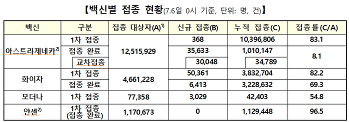 이로써 백신별 누적 1차 접종자는 아스트라제네카 1039만6806명, 화이자 383만2704명, 모더나 4만2403명이다.