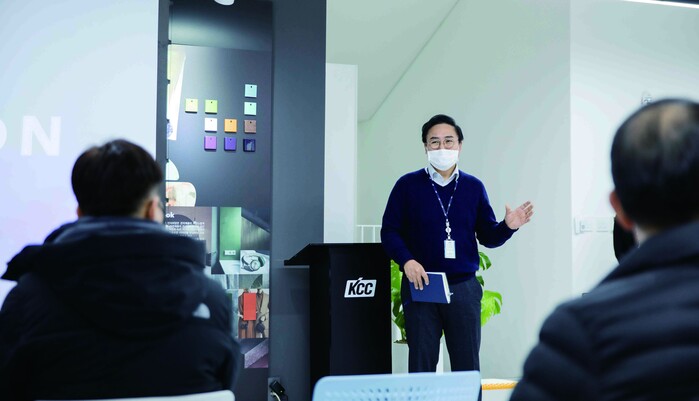 ▲ '트렌드 펄스 세미나'에서 KCC 직원이 고객에게 디자인 트렌드를 설명하고 있다. [사진=KCC 제공] |
