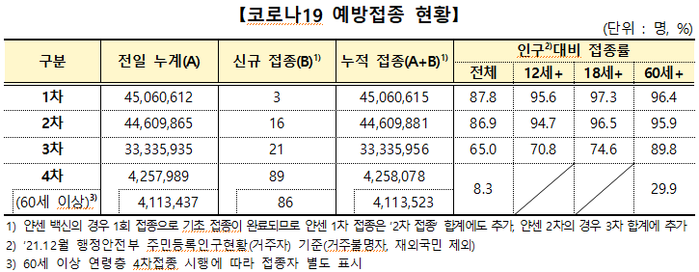 4차 접종자는 425만8078명으로 전국민의 8.3%((60세이상 29.9%)이다.