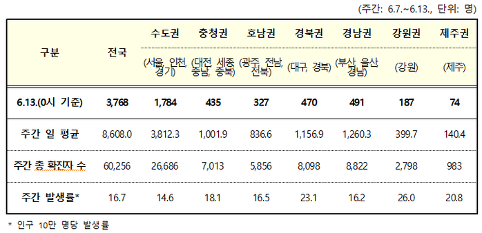 국내발생 확진자 중 수도권은 1784명(서울 659명, 경기 1021명, 인천 104명)으로 47.3%를 차지했다. 국내발생 주간 일평균 확진자는 8608명이다.