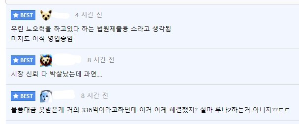 해당 게시물에는 “법원 제출용 쇼”, “시장 신뢰 다 바닥났는데”, “물품 대금도 못 주는 상황인데 뭘 믿고 입점하겠냐”, “신뢰 쌓는 건 어려운데 신뢰를 잃는 건 한순간” 등의 비판적인 댓글들이 연이어 달렸다.