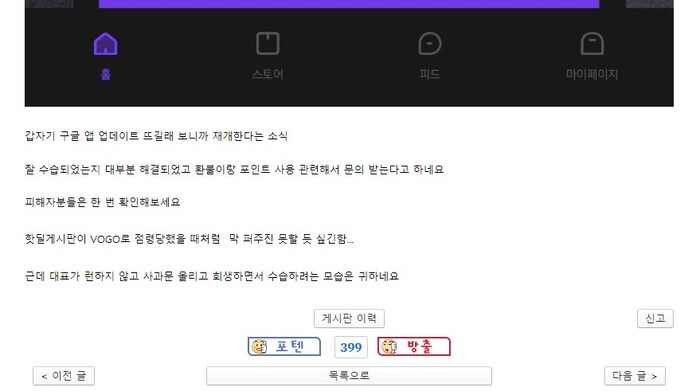 게시글을 작성한 누리꾼은 보고 서비스 페이지에 공지된 ‘RE-OPEN 03.14 10 am’ 화면을 함께 올리며 “갑자기 구글 앱 업데이트 뜨길래 보니까 재개한다는 소식, 환불‧포인트 사용 관련해서 문의받는다고 한다”고 설명했다.